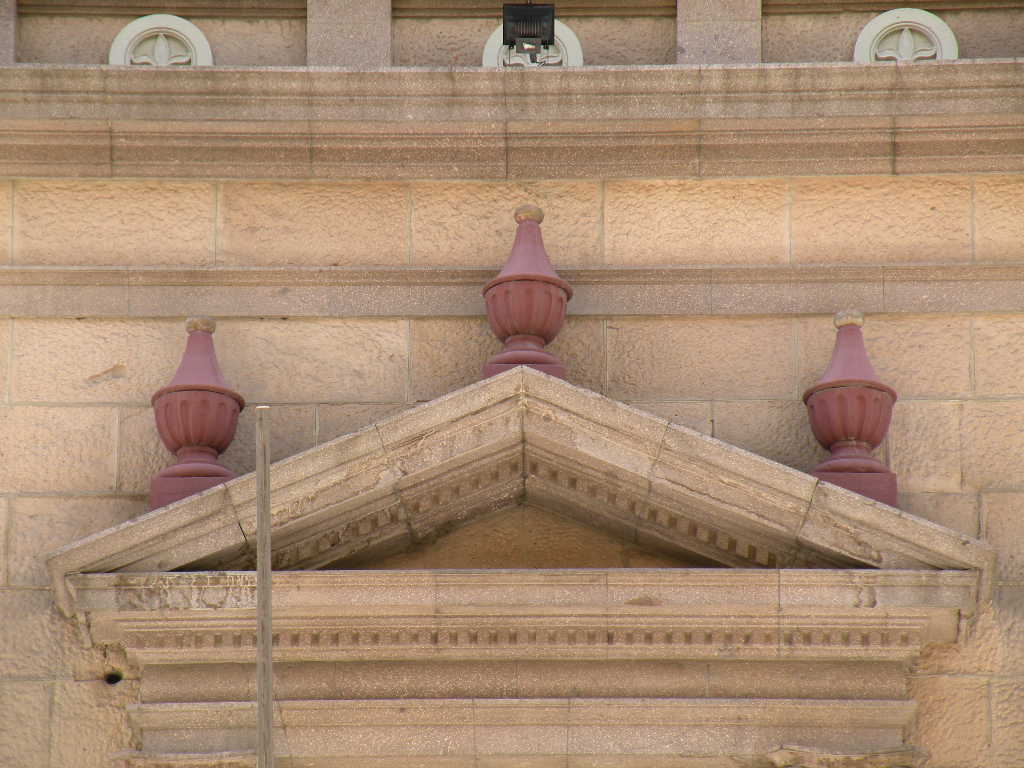 En arquitectura clásica, parte triangular que recuerda a un muro hastial y que corona el frente de una estructura, especialmente sobre un pórtico; tiene poca altura en relación con el ancho de la base. Suele aparecer tambien sobre vanos de puertas y ventanas y sus lados son generalmente rectos, auqnue tambien los hay de lados curvos.